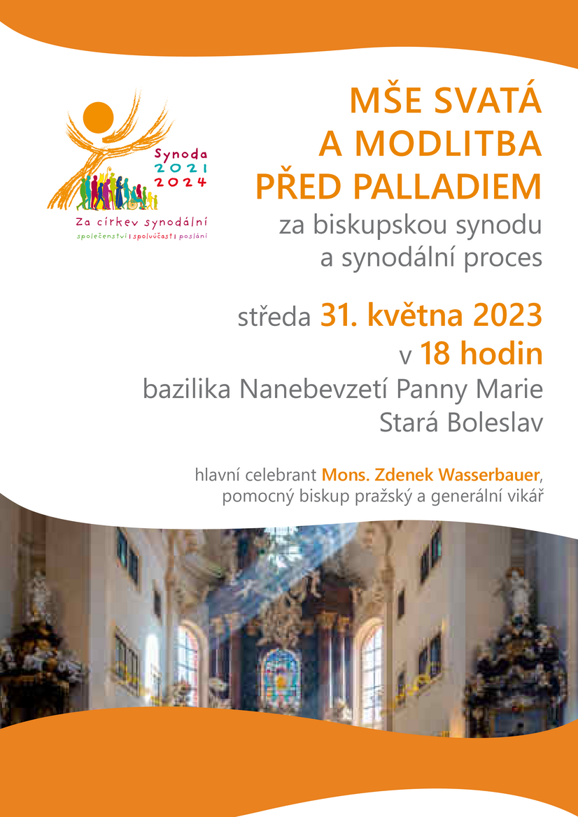 Mše svatá a modlitba před palladiem za biskupskou synodu a synodální proces. Kdy: středa 31. května 2023 v 18 hodin. Kde: bazilika Nanebevzetí Panny Marie, Stará Boleslav. Kdo: hlavní celebrant Mons. Zdenek Wasserbauer, pomocný biskup pražský a generální vikář.